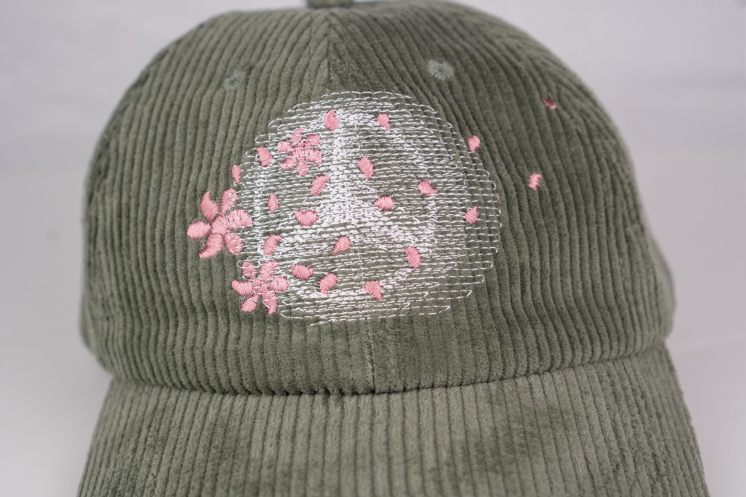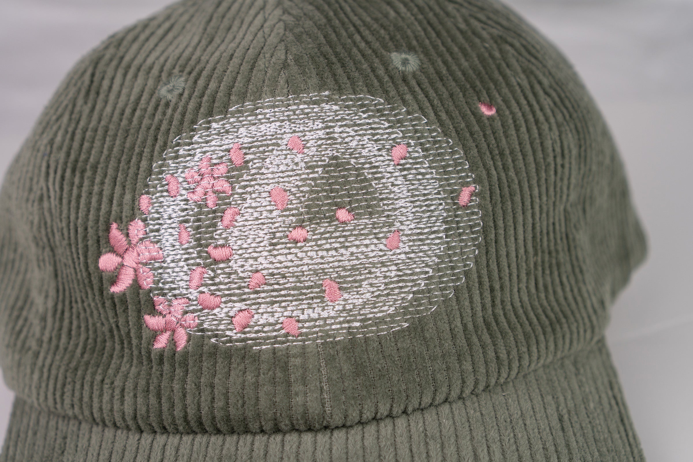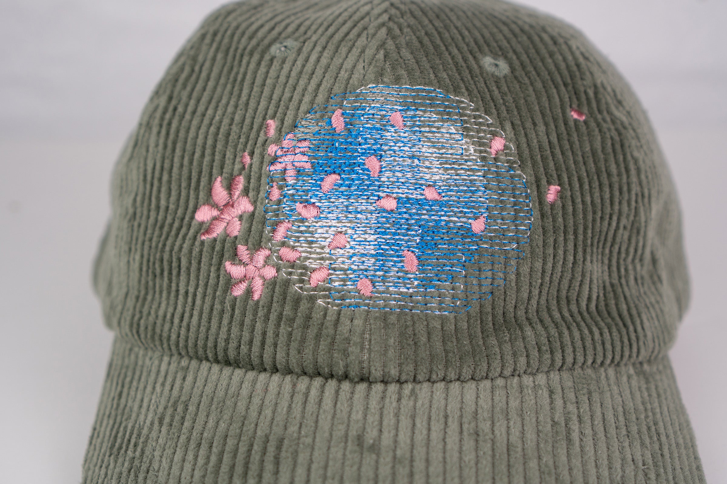 - dusty sage corduroy fabric | drifting petal embroidery over motion automotive blur front hit | petal propellerette flag blur right side hit