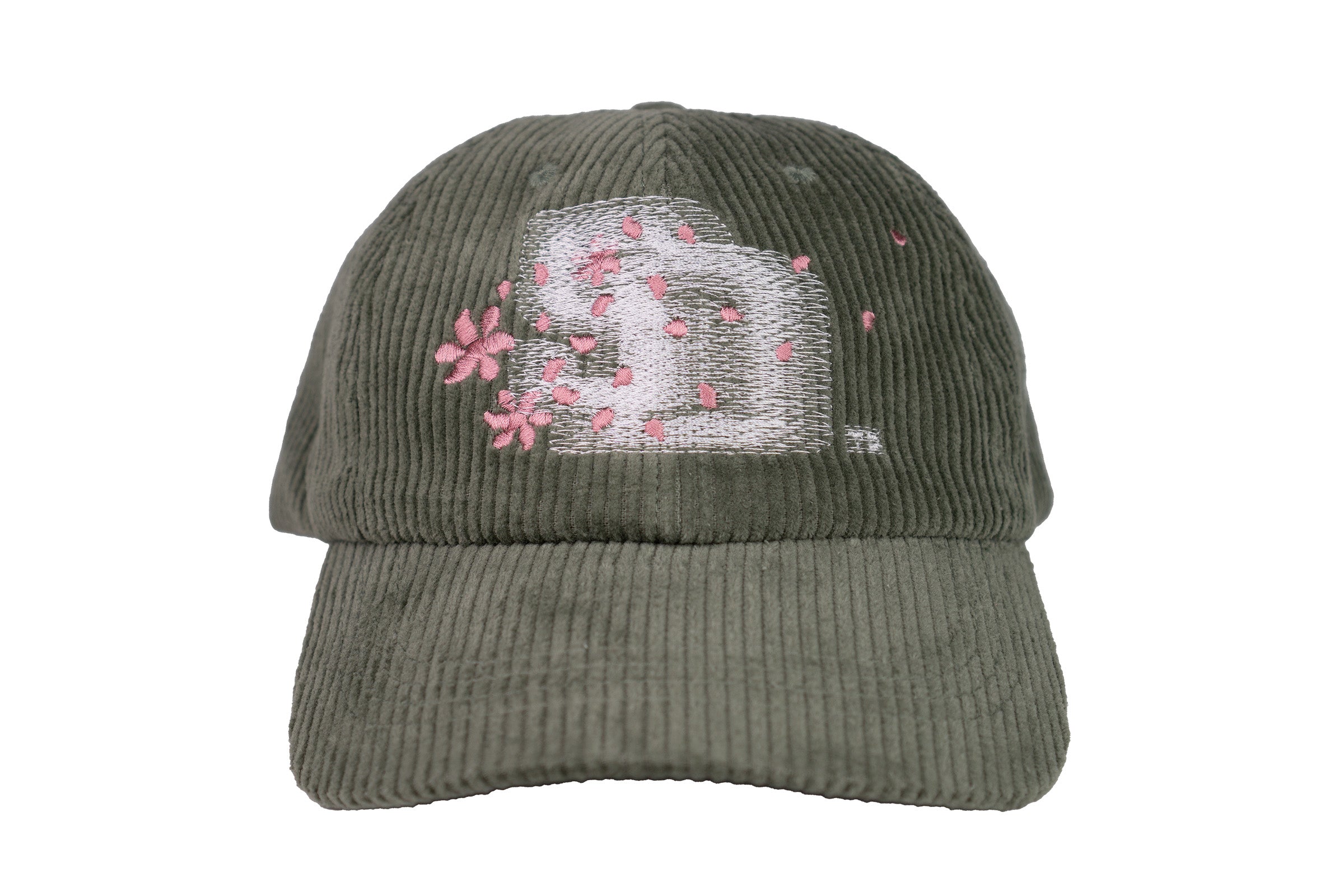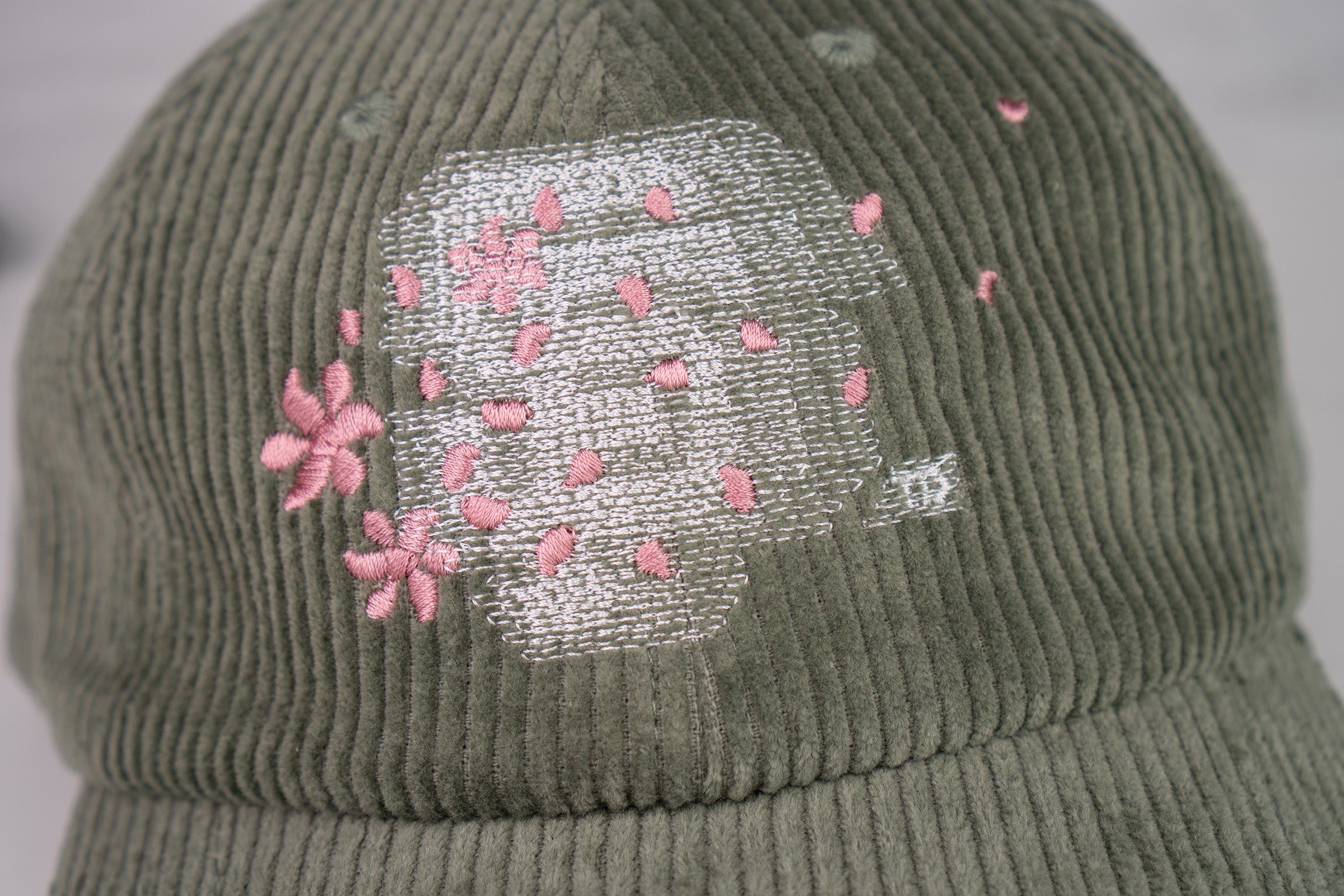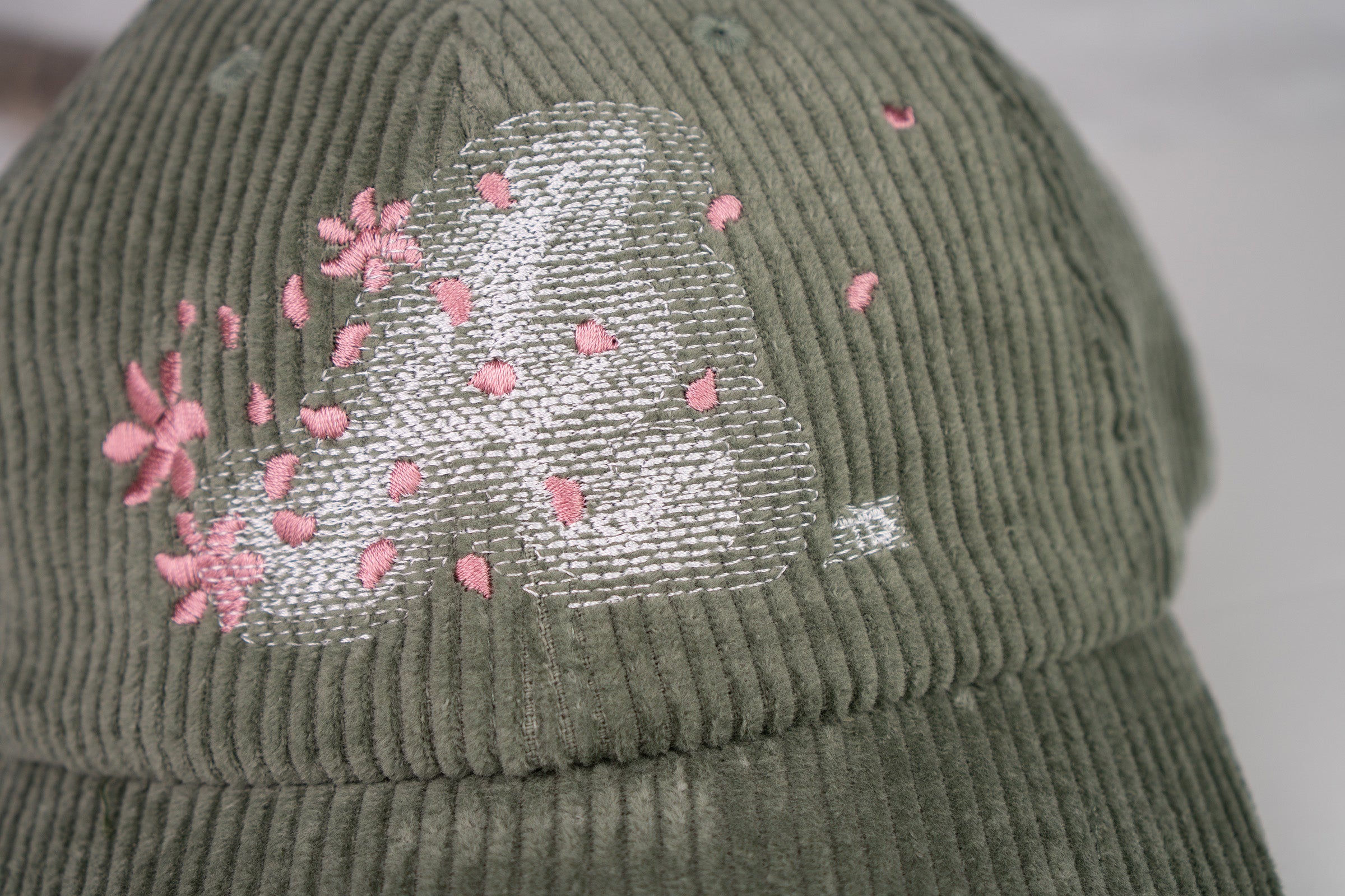- dusty sage corduroy fabric | drifting petal embroidery over motion city blur front hit | petal propellerette flag blur right side hit