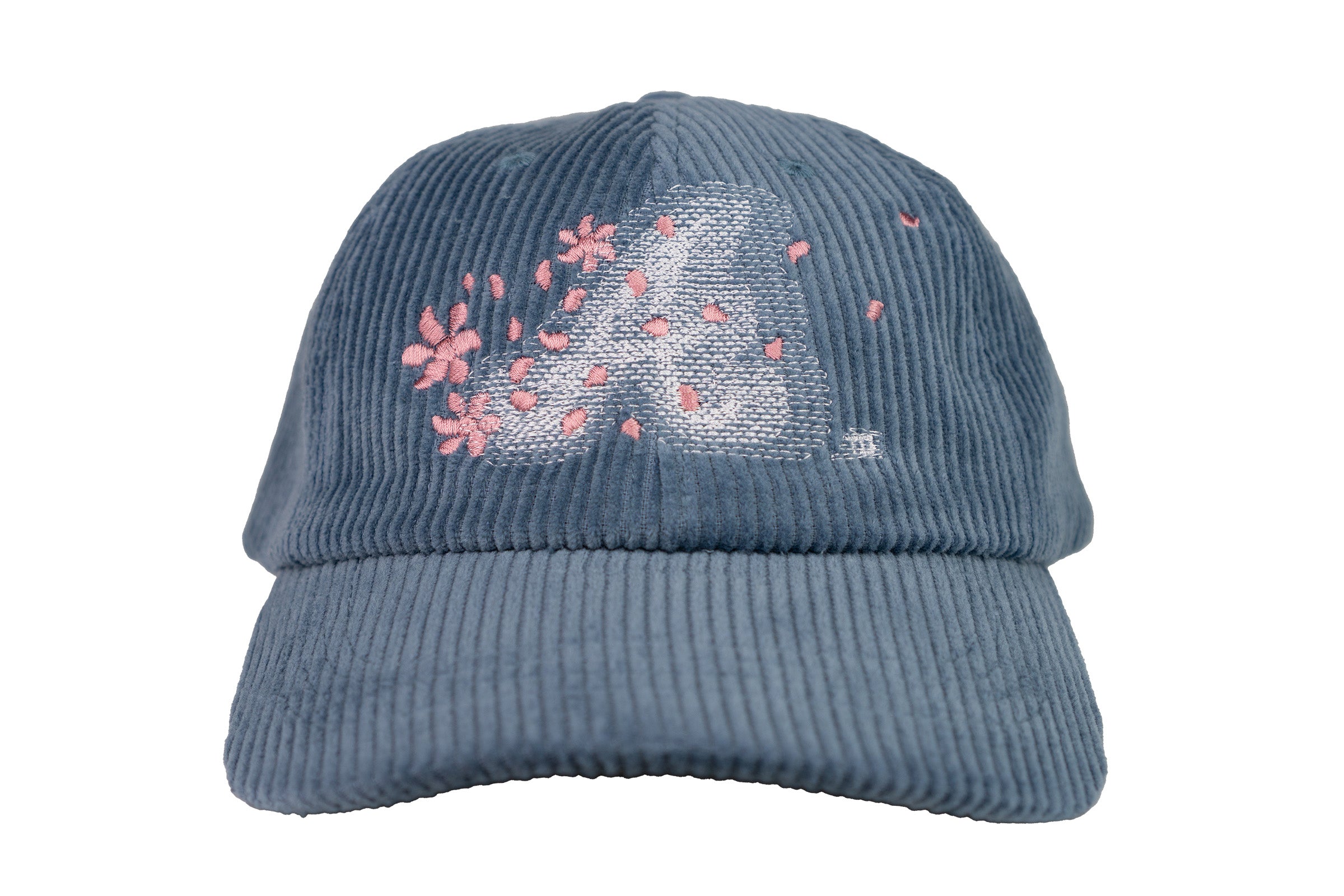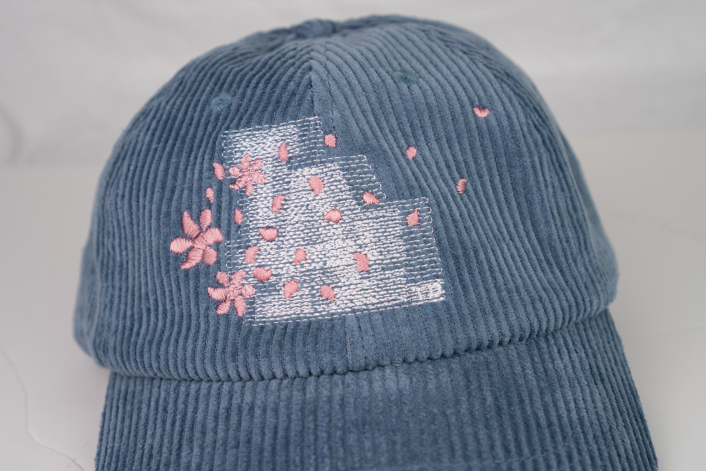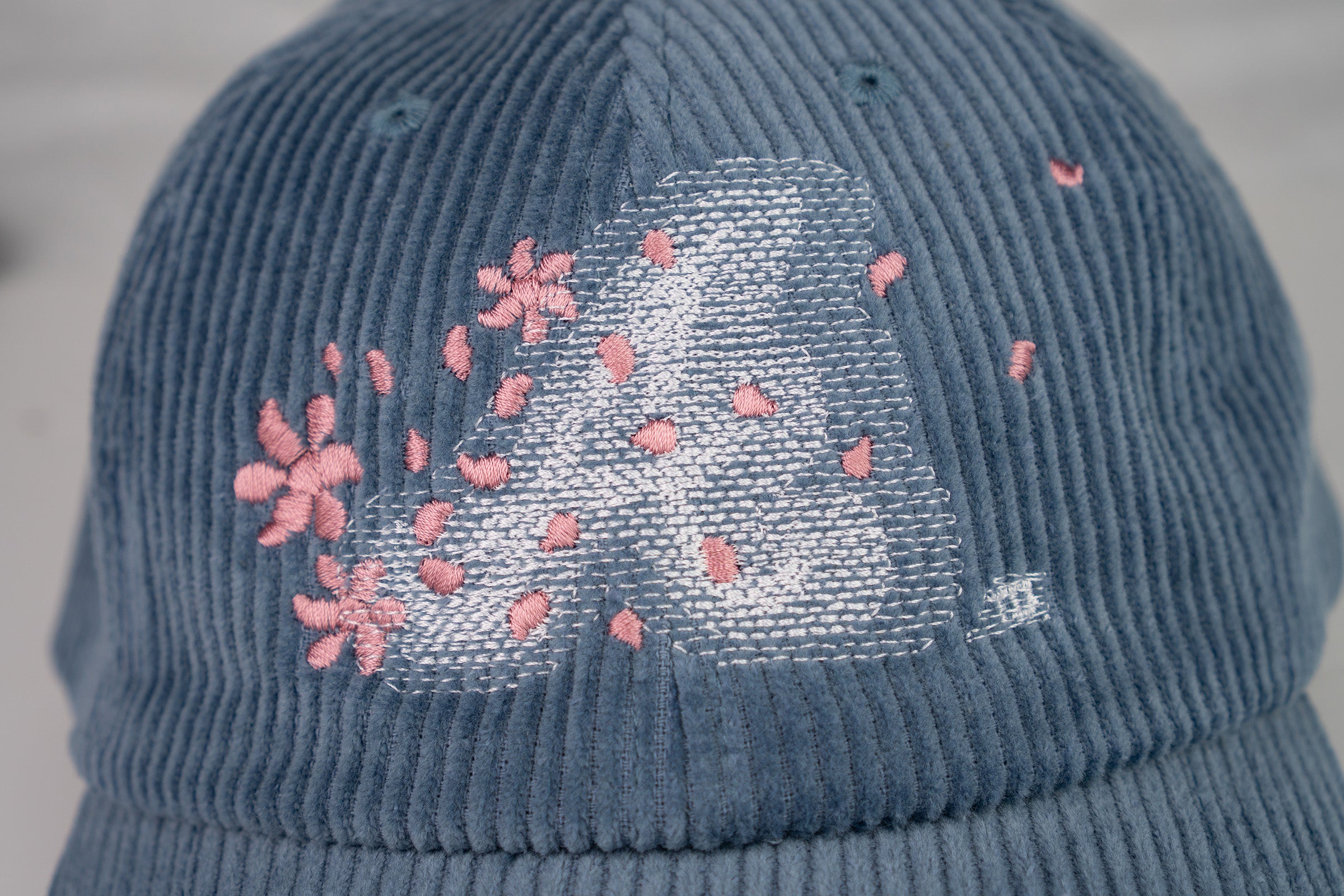- stone blue corduroy fabric | drifting petal embroidery over motion city blur front hit | petal propellerette flag blur right side hit