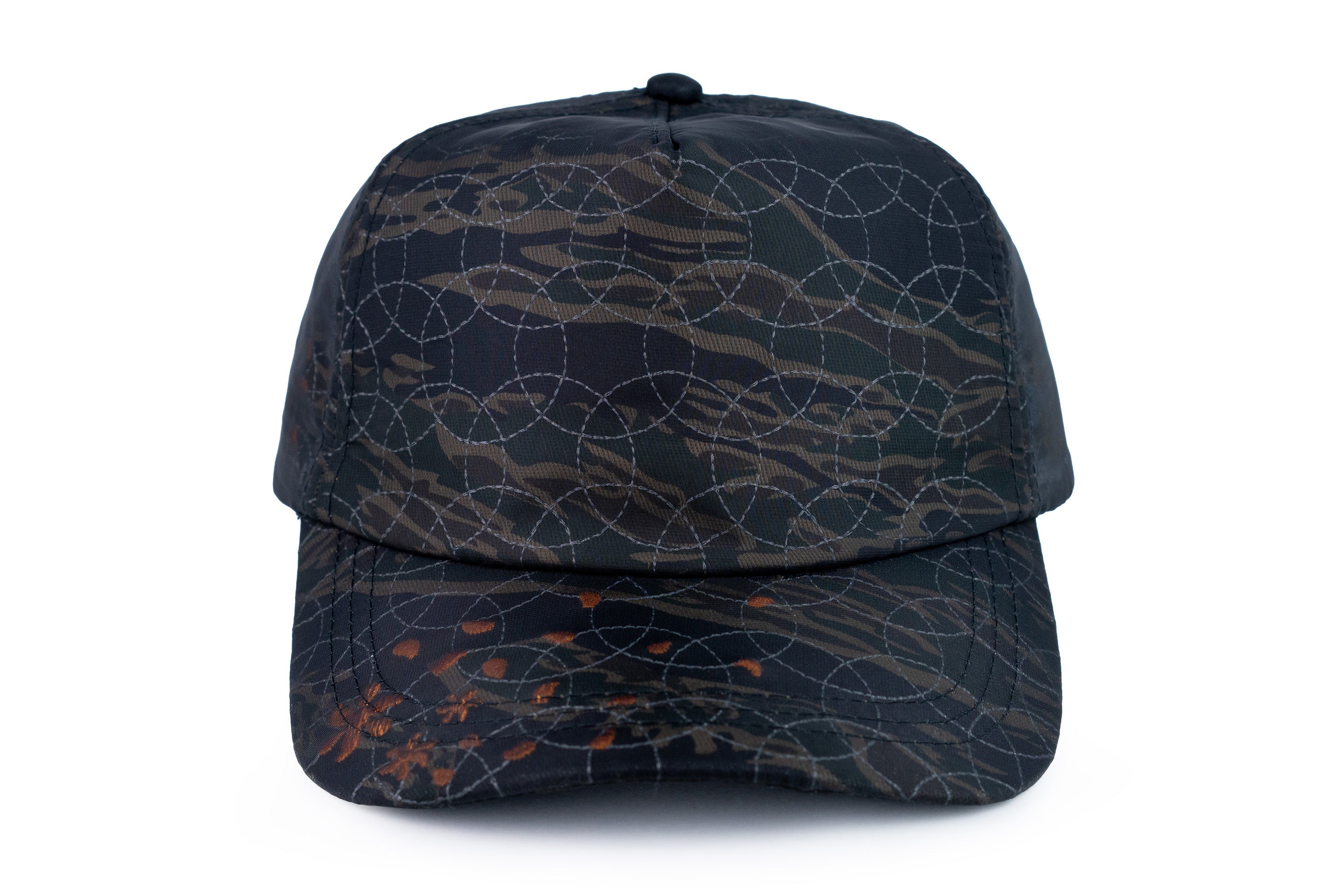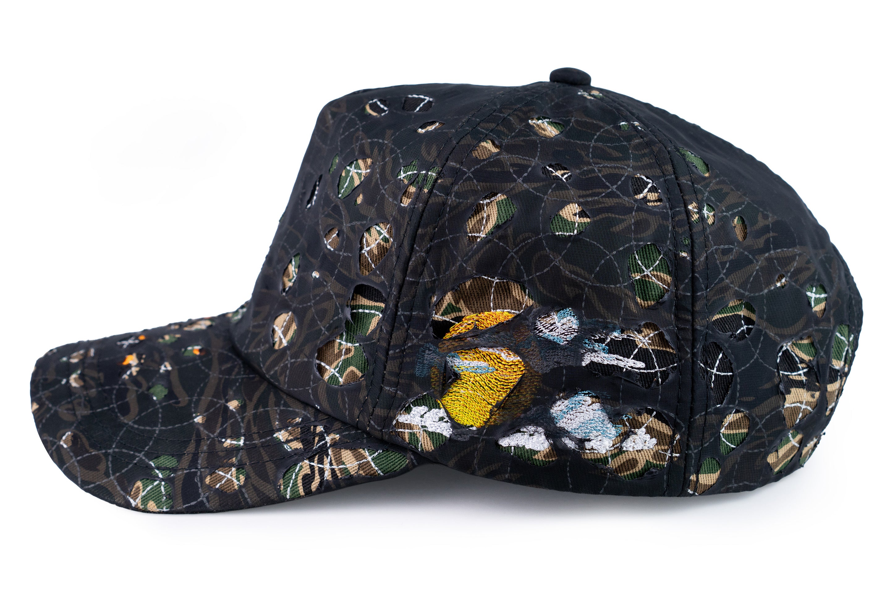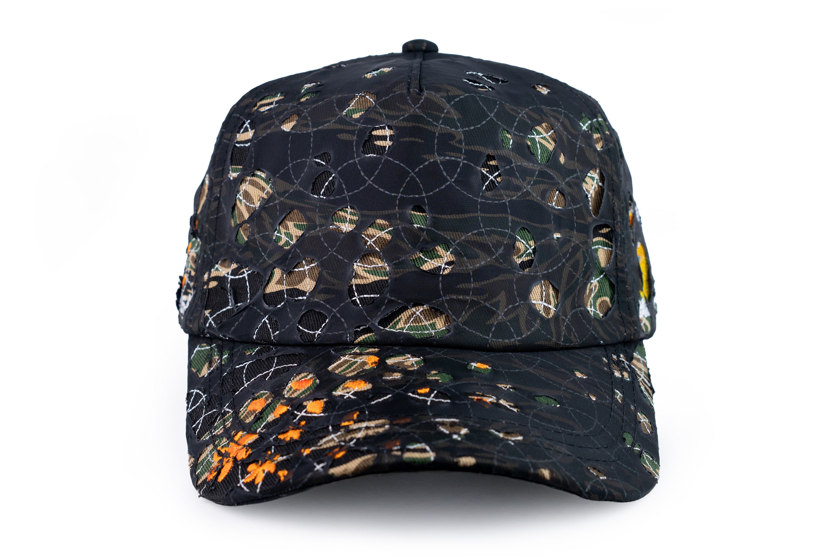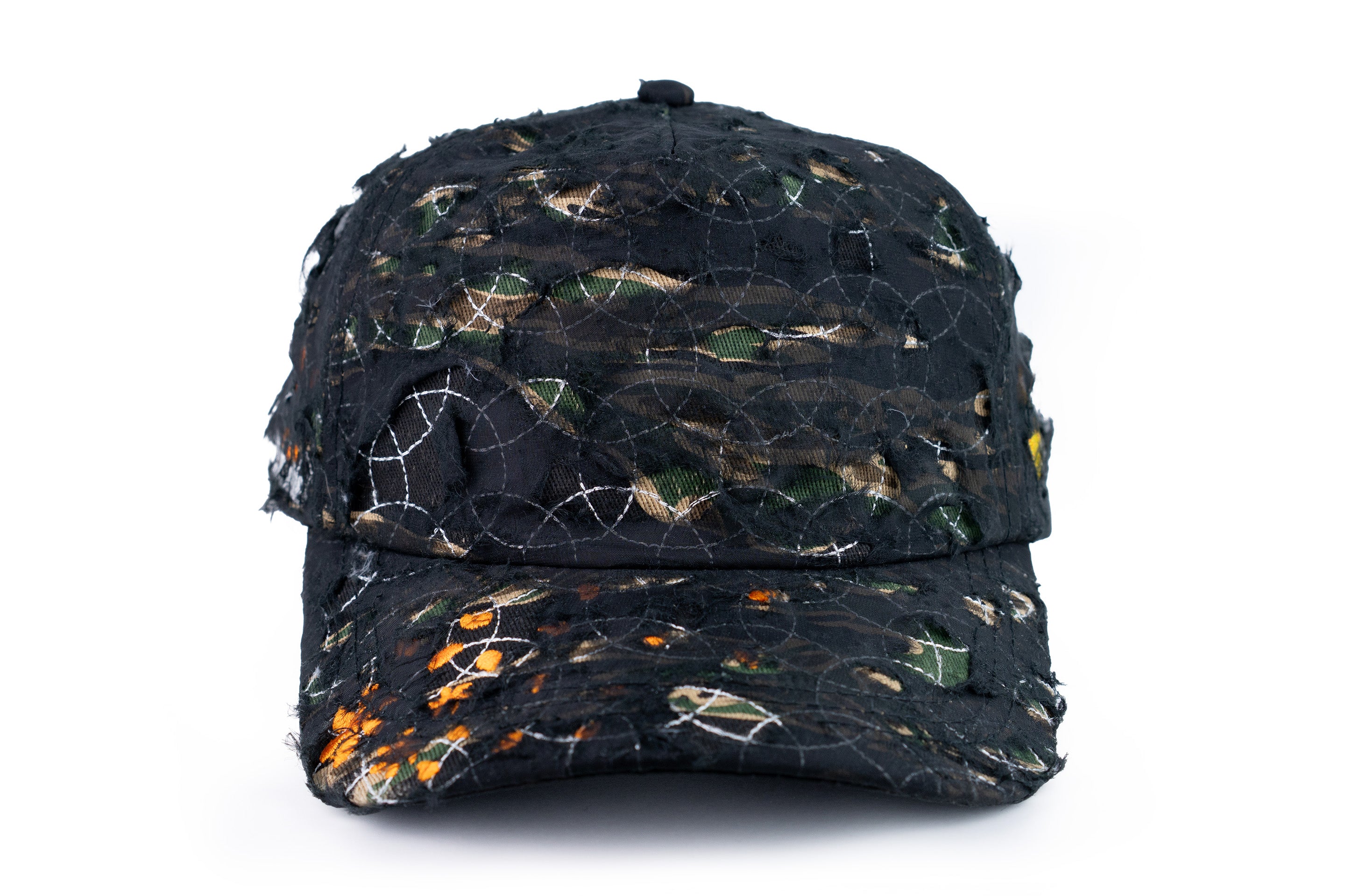 - onyx black sheer overlay that can be distressed to reveal tiger camo base and embroidery underneath, very exciting stuff